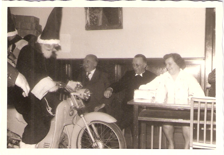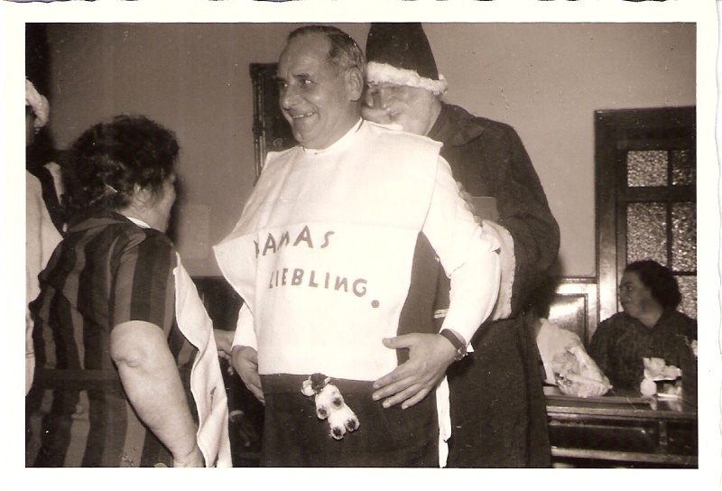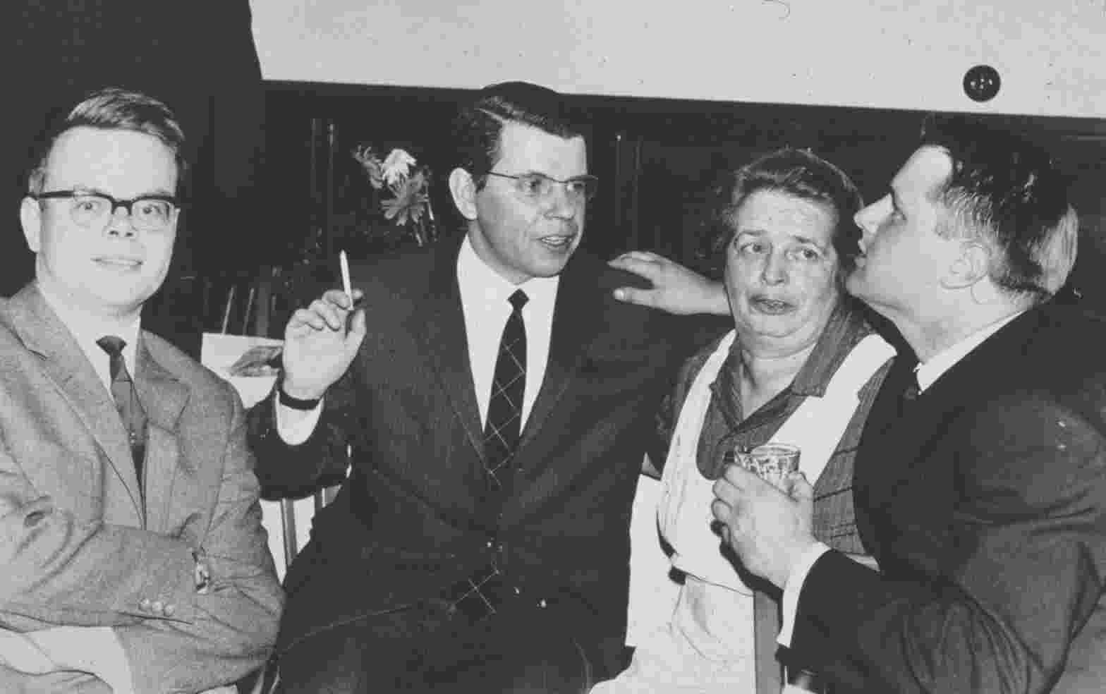v.l.n.r.: "Amigo" Hartmut Freund, Referendar Ewald Linke, Tante Lollo, "Schwamm" Günther Thiel als Ehemaliger.