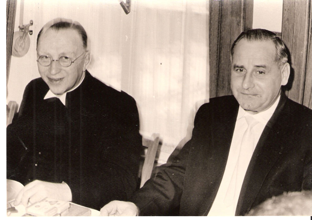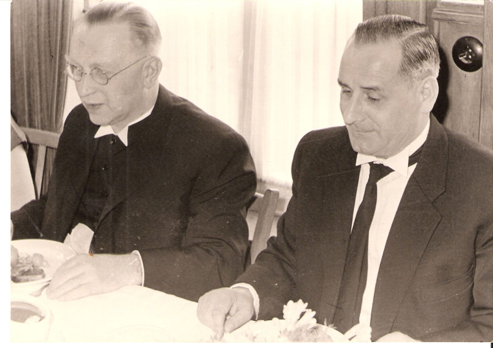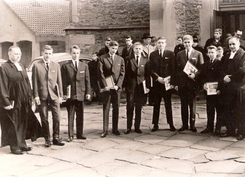 | Vorne v.l.n.r.: Pfarrer Rehorst, Friedel Brügger, Walter Kinhöfer, Bodo Schmidt, Jochem Loeber, Lothar Arnholdt, Bernd Federupp, Gerhard Glagow, Hausvater Pfarrer Willi Joneleit Im Hintergrund: Neben dem Auto Ernst Sarres, daneben Wolfgang Kleine, An der Kirchentür: Harald Hering |